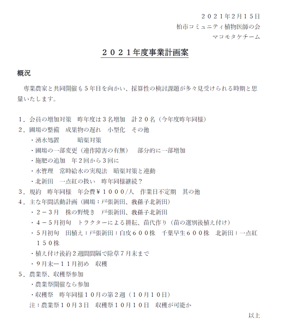 2021.4.14 2021年度 マコモタケチーム 活動計画 |