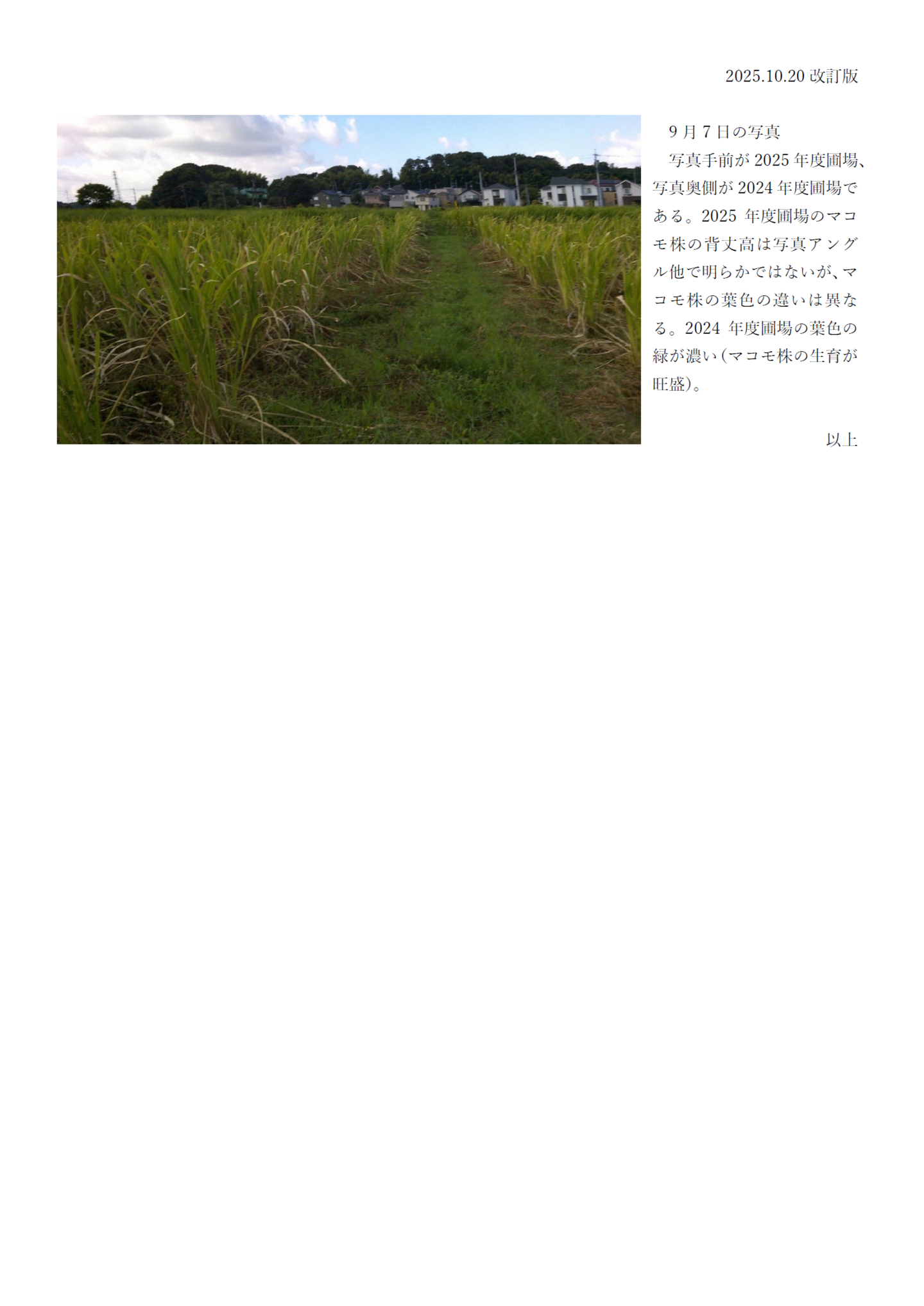 2025年度の本圃場のマコモ株の分ゲツ数がすくないのは、化成肥料の追肥(6月上旬の田植え後の活着と7月末のマコモ株の分ゲツ始まり)を雑草との戦いに敗れ、行っていないためでした。
